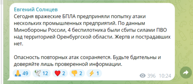 В своем аккаунте в соцсетях Солнцев написал: «Сегодня вражеские БПЛА предприняли попытку атаки нескольких промышленных предприятий. По данным Минобороны России, 4 беспилотника были сбиты силами ПВО над территорией Оренбургской области. Жертв и пострадавших нет. Опасность повторных атак сохраняется. Будьте бдительны и доверяйте лишь проверенной информации».