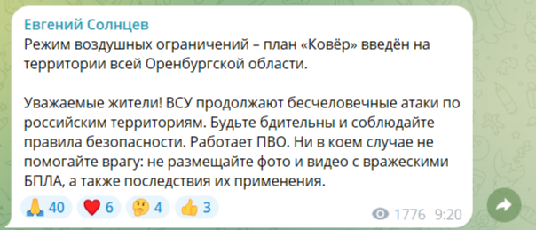 План «Ковер» ввели в Оренбурге в 06:55, а с 09:20 его распространили на всю область. Губернатор добавил: «ВСУ продолжают бесчеловечные атаки по российским территориям. Будьте бдительны и соблюдайте правила безопасности. Работает ПВО. Ни в коем случае не помогайте врагу: не размещайте фото и видео с вражескими БПЛА, а также последствия их применения».