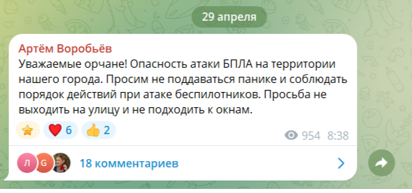 29 апреля в Оренбургской области в десятый раз за апрель объявили об угрозе беспилотников. Губернатор и мэр обратились к жителям.